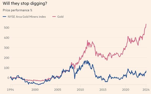 To set further set this up, gold has gone up in price, yet gold miners are lagging behind.