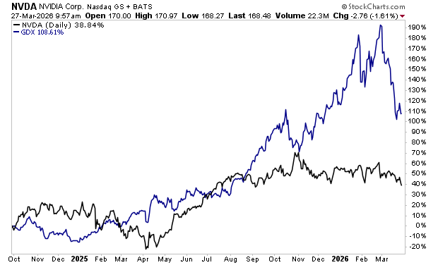 Nvidia (NVDA) is the most critical stock in the world to the AI trade. But Gold Miners (GDX) are outperforming it by a MASSIVE margin over the last two years… even accounting for the recent decline in GDX shares due to forced liquidations.